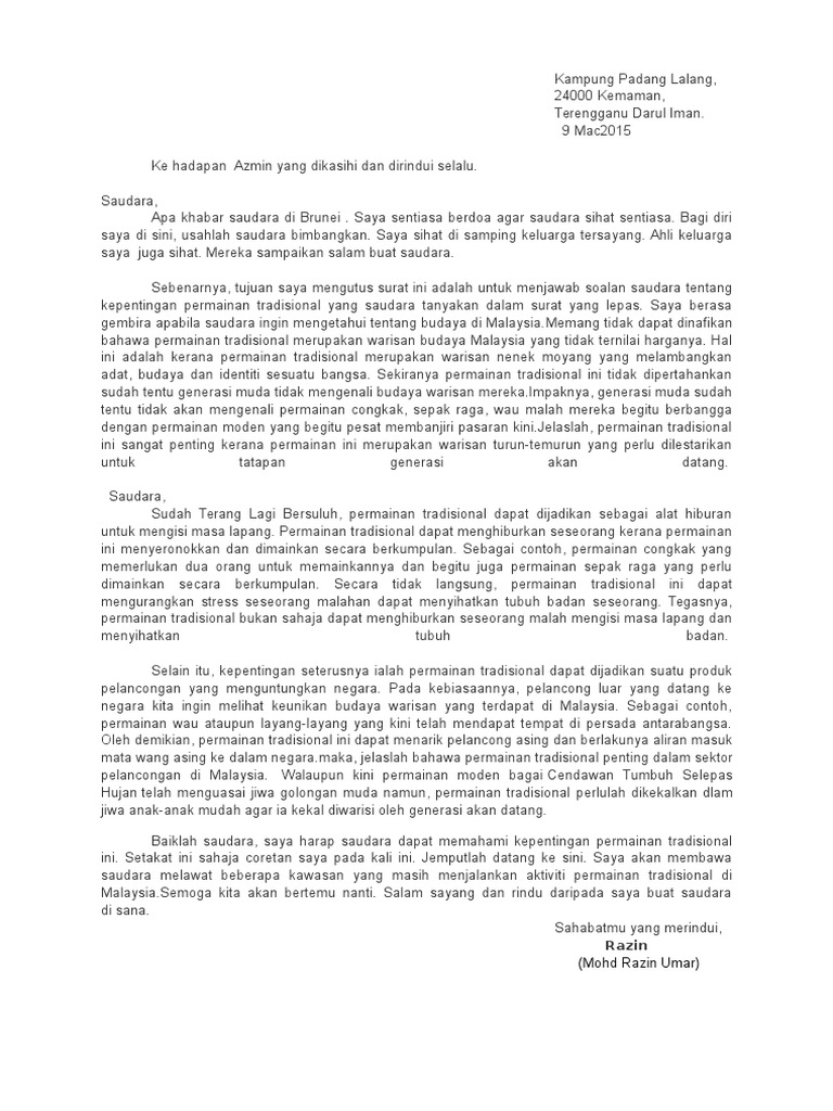 Mulakan menulis surat dengan bertanyakan khabar dan menceritakan keadaan kesihatan penulis. Jika membalas surat, sebelum menanyakan sesuatu, terlebih dahulu jawab pertanyaan yang ditanyakan sebelum ini. Semoga saudari sihat sejahtera bersama dengan keluarga tercinta. Balas surat sahabat pena yang ingin berkunjung ke negara anda untuk melawat suatu tempat pelancongan yang menarik. Learning port interactive (lpi) merupakan portal pembelajaran yang dibina selaras dengan keperluan silibus pelajar tahun 1 hingga tingkatan 5.